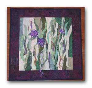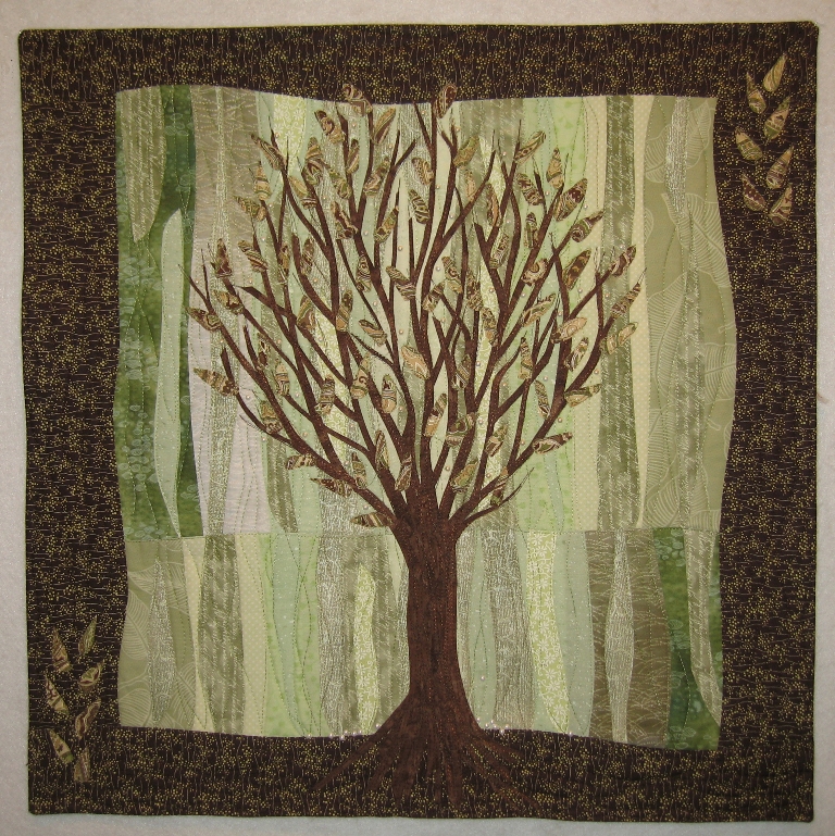 It took me awhile to be inspired by this year's Hoffman Challenge fabric. But finally, the idea for Woodland Spring surfaced. New leaves and blossoms are just appearing in the forest. I used my Lazy Landscape for the background and my Graceful Trees design. Hot fix pearls made the sweet little blossoms. Woodland Spring will travel in trunk QC-F.